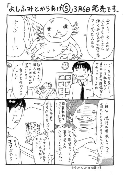 飯窪春菜 1日1冊漫画紹介 今日ご紹介するのは よしふみとからあげ です ある日帰宅すると ペットのウーパールーパーが喋るようになっていた バツイチ社畜 Moe Zine